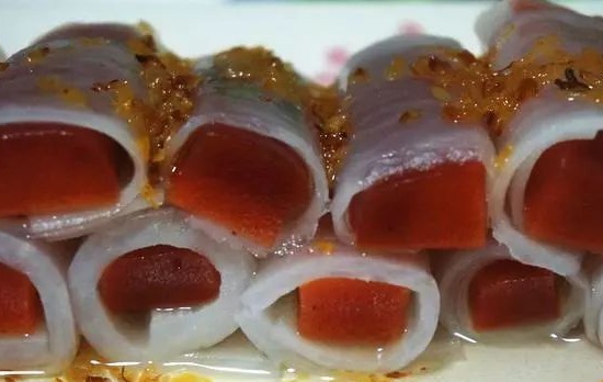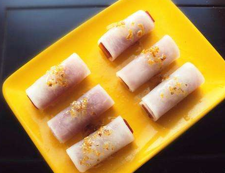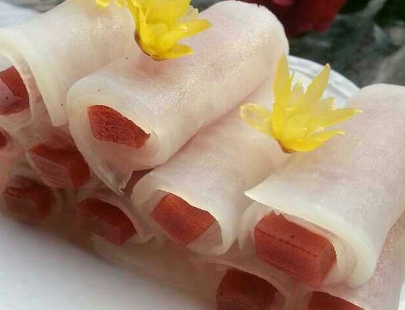 萝卜捞出后,铺在案板上,放上山楂糕,从一头开始卷向另一头,记住要卷紧一点,做好后不松散好看也好夹,再摆在盘中,摆出自己想要的造型,碗中加入一些白糖,可以用少量开水搅拌化开,再加入一点点白醋,搅拌均匀,淋在萝卜山楂糕表面,最后再浇一些蜂蜜水,还可以点缀一些桂花,看起来非常精美,很抢眼呢。