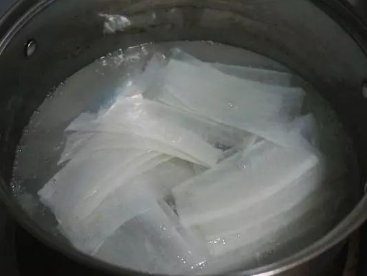 一个萝卜都刮成薄片后,锅中加入适量清水,烧开后,将萝卜片放入锅中烫一烫,萝卜片变软后就要捞出了,别烫的太久,然后放在准备好的凉水里冰一下,增加萝卜的口感。接着将山楂糕切成和萝卜片宽度相等的小段。