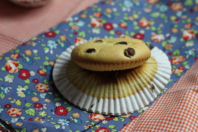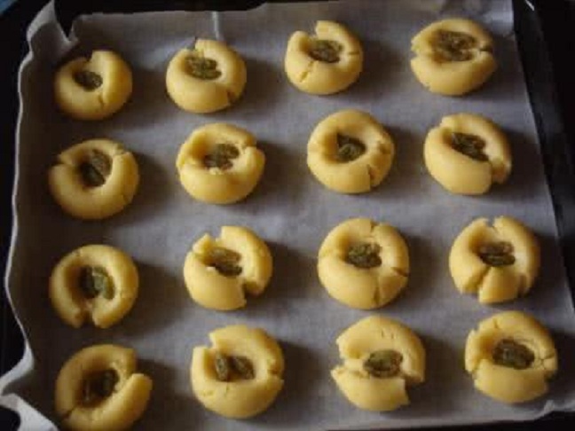 7、取一面团揉成小圆球,放在铺有油纸的烤盘里,然后用手指按扁放上葡萄干,烤箱180度预热5分钟,放入烤箱上下烤10分钟