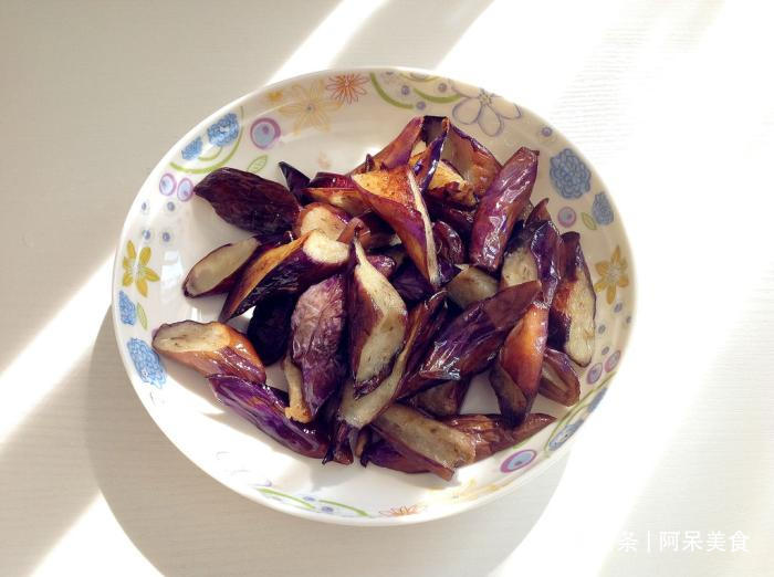 4、热锅,倒入适量的色拉油,中大火,将茄子炸至变软,肉变透明,盛出,沥油