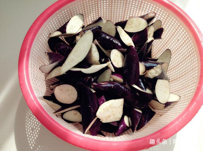 1、茄子去蒂,洗净,擦干表皮的水分,切滚刀块。喜欢的也可以切长条