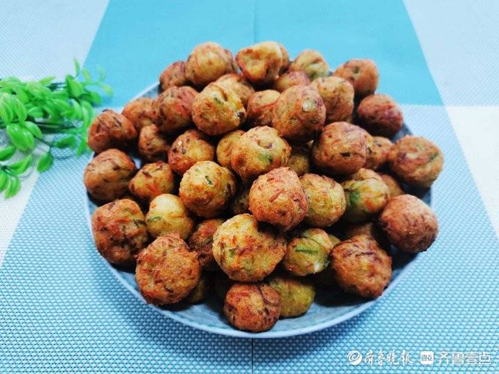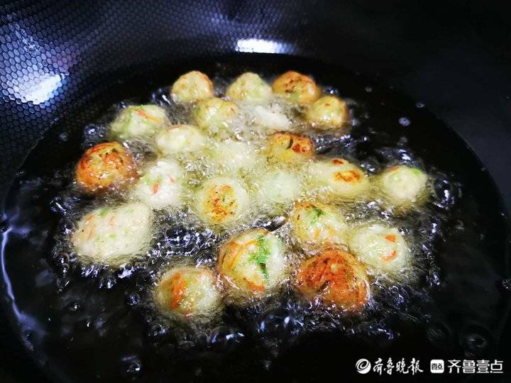 4、炸制:用水沾手,将调制好的萝卜馅弹搓成一个个大小均匀的小丸子,放入六七成热的油锅中,小火炸制,勤翻动,待炸至金黄,出锅即可。