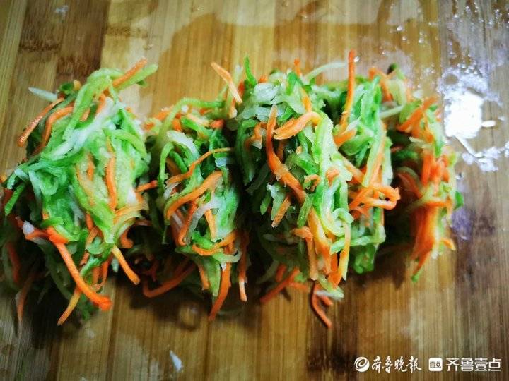 3、制作:两种萝卜擦丝,用少许盐腌制10分钟,然后将多余水分挤出,改刀切几刀备用。鸡胸肉剁碎,豆腐捏碎,半块馒头去皮,也揉搓碎,(放馒头碎主要为起酥、口感好,好消化),所有配料、佐料倒入一起,打入一个鸡蛋,充分拌匀,最后加少许玉米淀粉和面粉(起粘稠作用)。