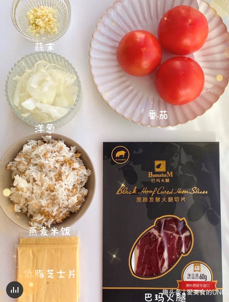 番茄、蒜末、洋葱、米饭、芝士片、、火腿