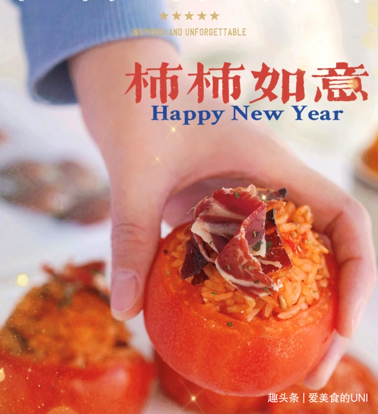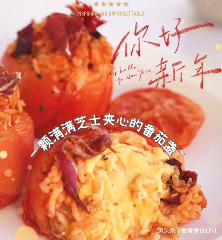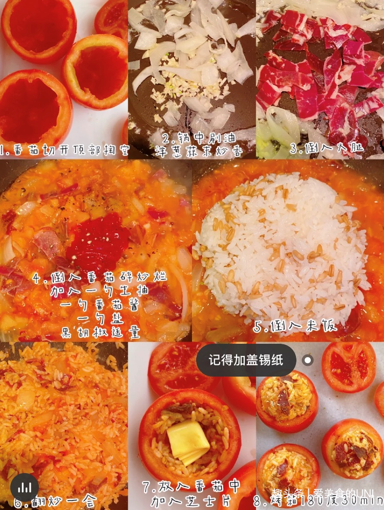 第四步:倒入米饭翻炒一会儿盛出,放入番茄中,中间放入芝士。