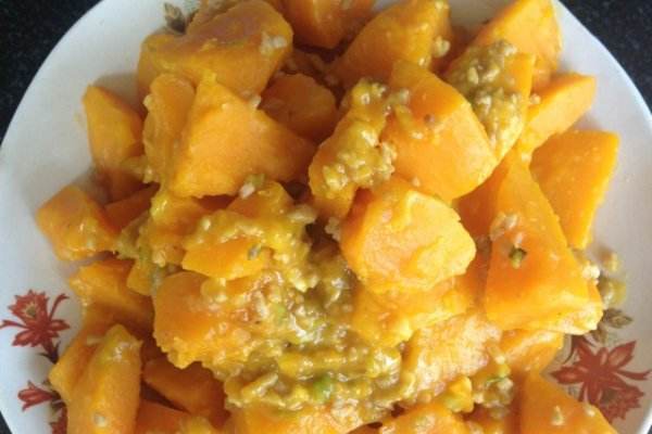 4.蒸好的南瓜从锅中取出,碾成南瓜泥。