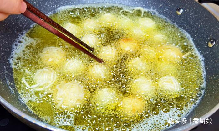 第四步:热锅加油,油温烧至五成热后,下入缠好面条的鹌鹑蛋,彼此之间,留有一定空隙,防止黏连在一起。注意:鹌鹑蛋刚下入锅中时,不要着急翻动它,等到面条定型以后,再用筷子轻轻地搅动。