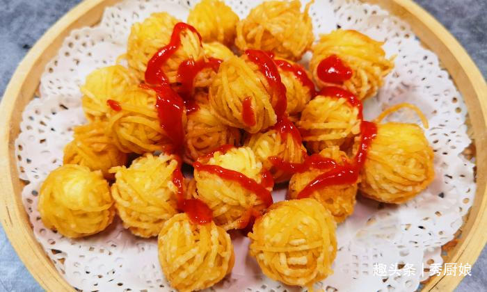 第五步:中小火炸3分钟左右,将面条炸至金黄色后,控油捞出,装入盘中,最后,浇上一点番茄沙司,一道营养美味,寓意吉祥的年夜菜,腰缠万贯就做好了!