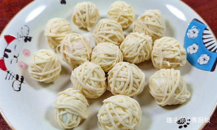 第三步:取一根鲜面条,将鹌鹑蛋横七竖八地缠起来,如果一根面条太短,没法将鹌鹑蛋完全包裹起来的话,就多用几根面条,把最后一根面条头和某一点的面条,捏在一起就可以,鹌鹑蛋全部都缠好后,装入盘中备用。
