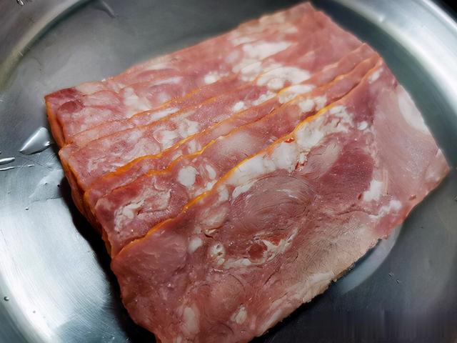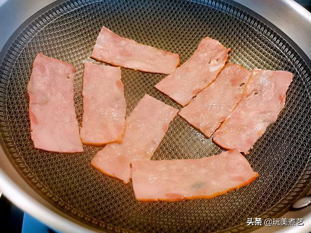 培根下锅煎至两面金黄。锅中不必放油,它自带油脂,小火慢煎。