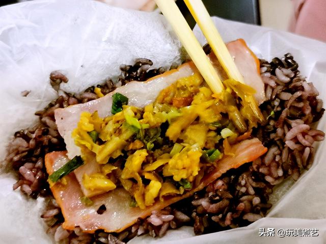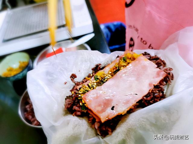被烘焙纸包住的紫米饭团,有保温作用,放慢心思,咀嚼每一口米饭与培根、萝卜干等等,在口腔中混合,咸香可口,米粒弹牙。