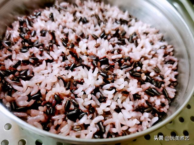 紫米加大米、糯米,洗净后加等量的水,浸泡半小时,上蒸箱蒸熟。