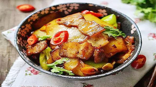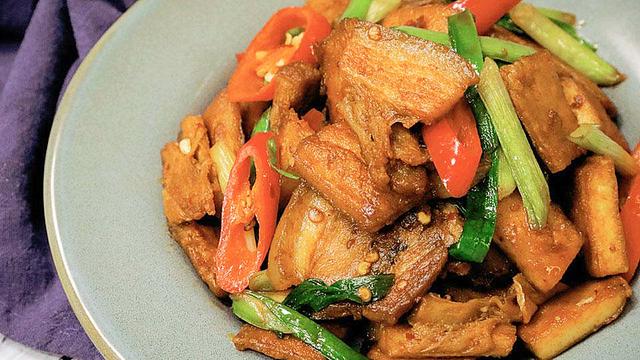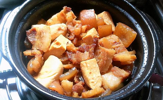 香干煨得越久,味越好、所以只能等香干煨入味后再下入五花肉。在煨制时汤可多放一点原汁,一定不能烧干。在煨制时,五花肉、干椒段、豆瓣酱等会出红油,所以不需另加红油。