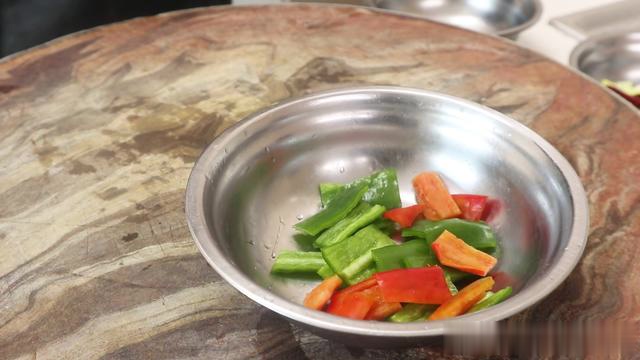 3.准备青椒半个切成片,红椒半个同样切成片,用来配色,和青椒放在一起。