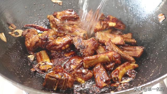 11.然后改成小火,把排骨炒上色,把排骨炒上色以后,加入适量的清水,大概700ml左右,没过排骨为宜。