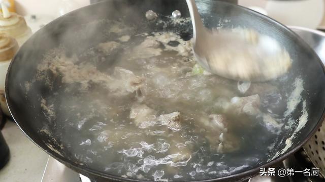 5.凉水下入排骨,开大火烧开。