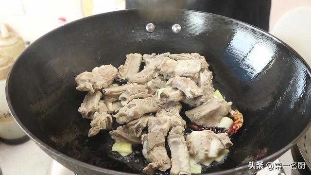 9.炒香以后倒入排骨,翻炒两分钟,把排骨表面炒至金黄。