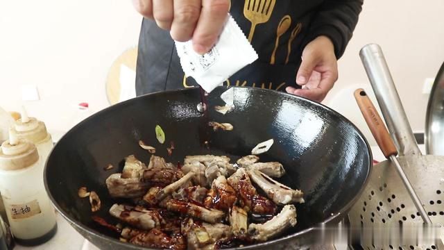 10.把排骨炒香以后加入一包红烧酱料,一包60克就可以了。