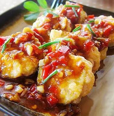 材料:长条茄子250g,鱼肉200g,虾仁50g,油,盐,生抽,料酒,白胡椒,糖,醋,姜,剁椒,淀粉,蒜。