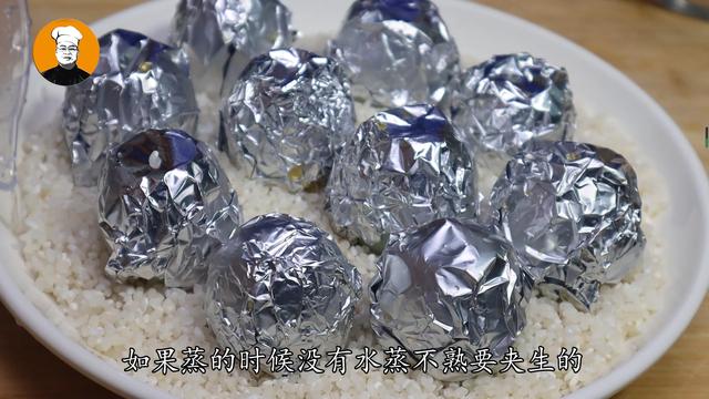 5、再把咸蛋的蛋白三分之一倒入松花蛋蛋白中,搅拌成稍厚点的糊状就可以了,再重新灌回咸蛋中,尽量灌满一点,再用锡纸把它包一下,防止蛋液流出来。再把鸭蛋竖着摆在大米中,这样蛋液不会流出来,10个蛋全部弄好,再倒入凉水。