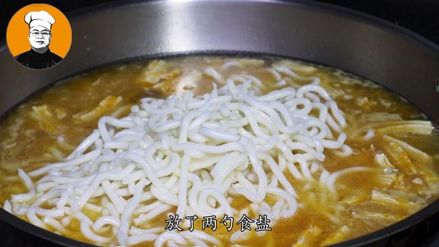 7、热锅倒油,放入姜蒜末爆香,再放入一勺野山椒辣酱,再放入牛肉原汤、碾碎的南瓜泥,大火烧开,把南瓜泥搅散,烧开后把腐竹、乌冬面放进去,再放入两勺食盐,大火烧开