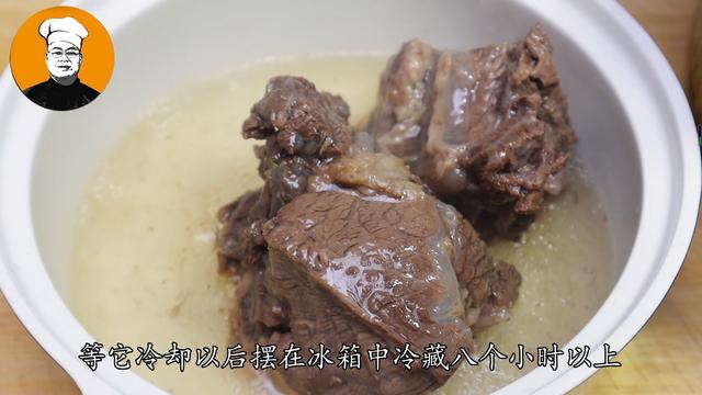 5、再放入姜片和料酒,再放入漫过食材的凉水,盖上锅盖大火烧开,上汽后转中小火,慢炖半个小时,然后捞出放在砂锅中,再倒入牛肉原汤,这样牛肉不会干了发黑,冷却以后摆在冰箱中冷藏八个小时以上