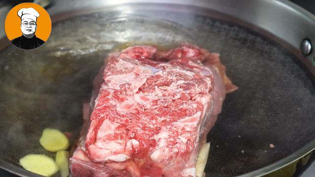 4、先把牛肉冷水放入锅中焯水,再放入姜片和料酒去腥,锅开后撇去浮沫,如果不焯水可以拿清水泡一个小时。然后捞出清洗干净。再改成小块放入高压锅中