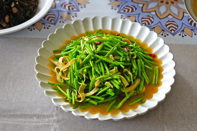 比如这道芦蒿炒千张,鲜嫩的芦蒿才3块一斤,再买1块钱的千张搭配着爆炒,一道十分鲜美好吃的家常菜,4块钱就搞定了。