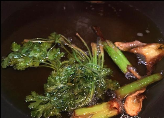 (上图1)将处理过后的油倒入锅中,下入适量姜片、葱段、香菜结、圆葱丝、切菜段,小火慢炸;