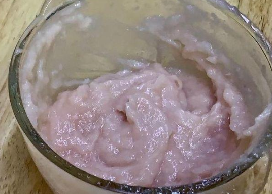 第五步、就这样这样反复多次的,一斤纯鱼肉大约打入二两葱姜水,通过反复搅打,鱼的细刺都会打碎。然后将打好的鱼茸用手像一个方向不断搅拌,这样可以它上劲。这一步非常的关键,想要鱼丸嫩滑弹牙,那就的这样搅拌。