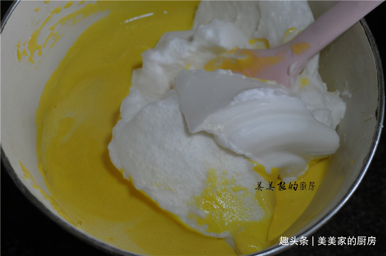 将三分之一蛋白霜加入蛋黄糊中搅拌均匀。