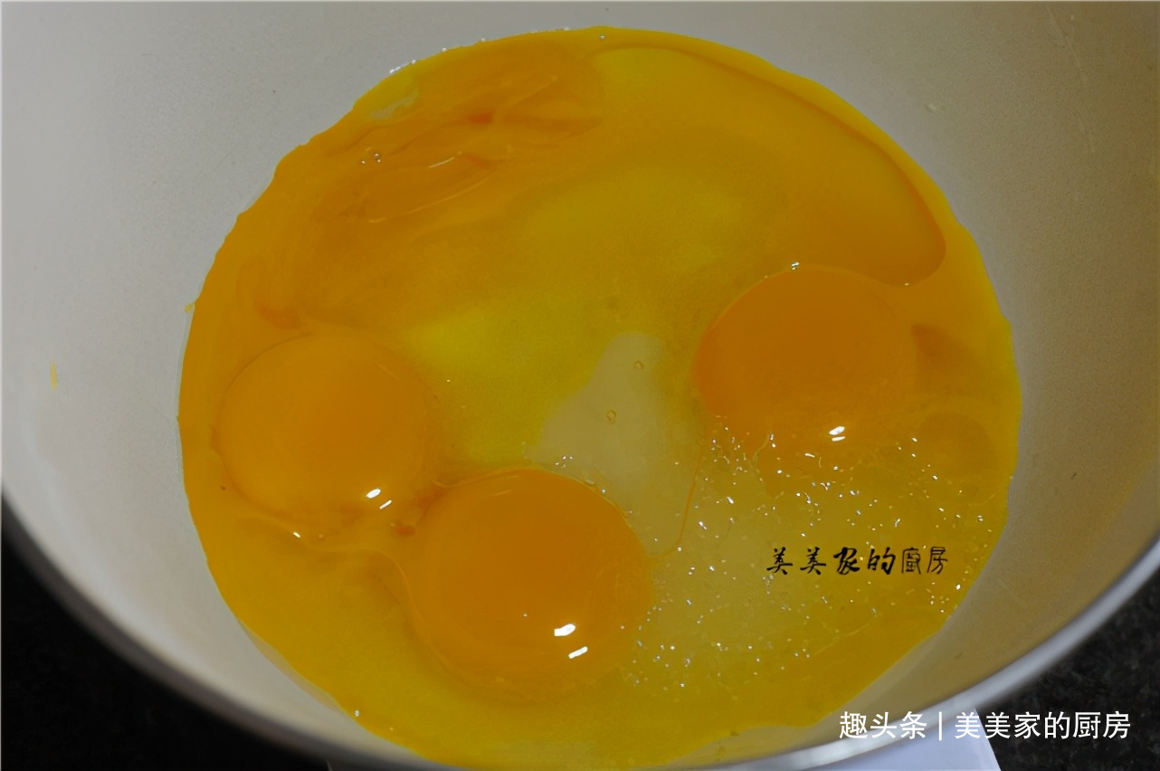 分蛋时将蛋黄放入另一个盆里,加入玉米油和水混合,用打蛋器打匀。