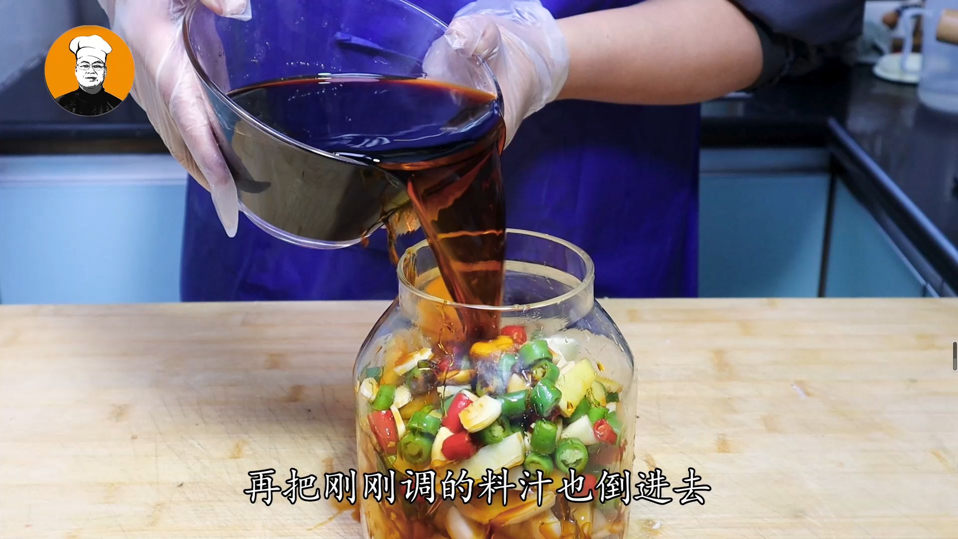 6、再把青红椒、蒜片和姜片也放进去。腌制过程全程不要接触生水,这样保质期更长,再把调好的料汁也倒进去,料汁刚好漫过食材就可以了,盖上密封盖,摆在冰箱冷藏腌制6个小时即可食用