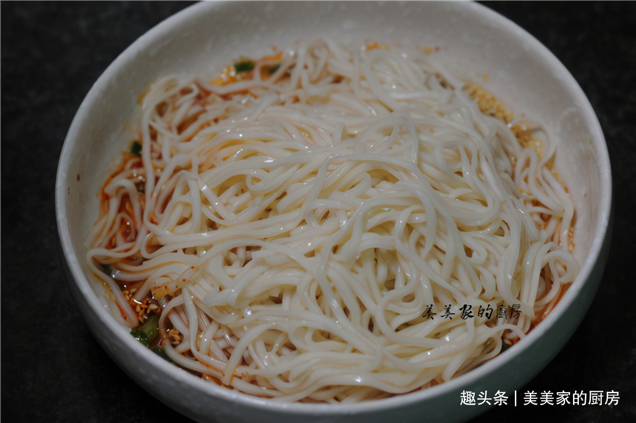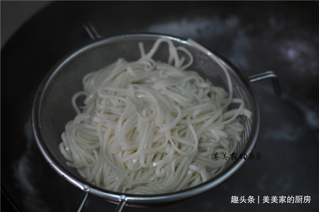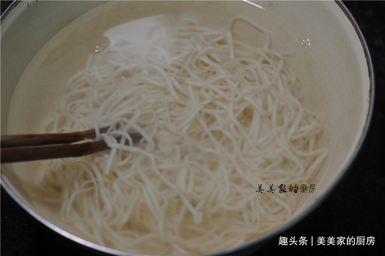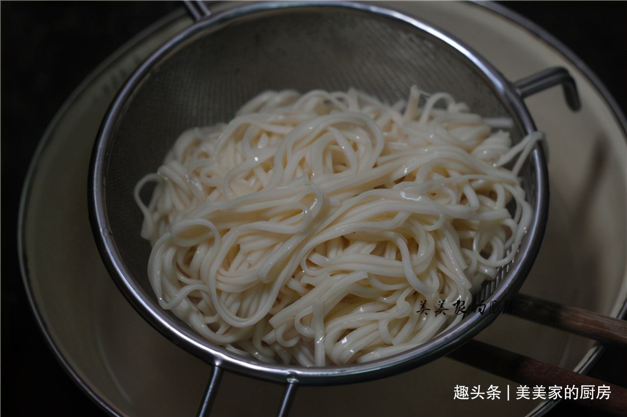 放入提前准备好的热水中,将表面的淀粉稍微清洗一下,这样面条拌的时候就变得更清爽,不会粘连在一起。如果天气热,想吃凉的话,可以用冷开水过。