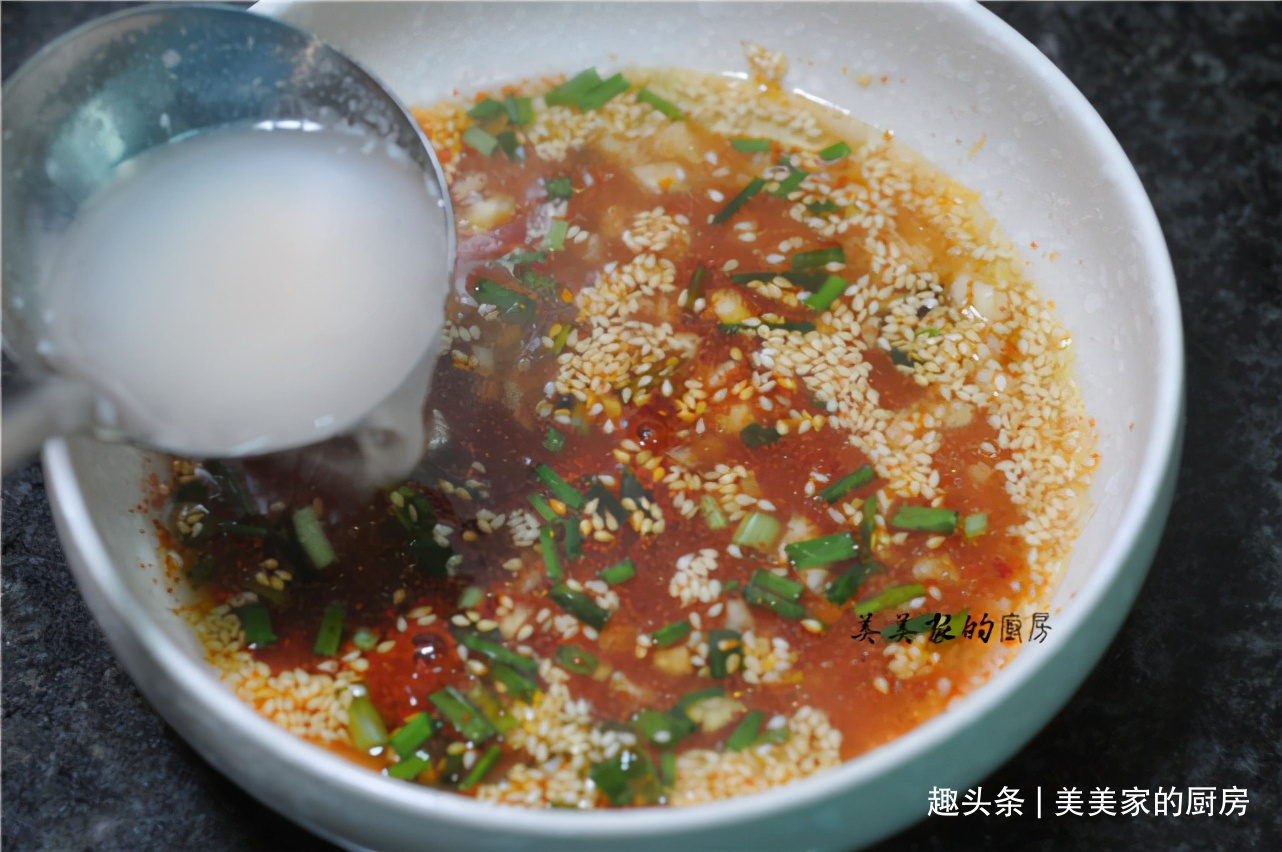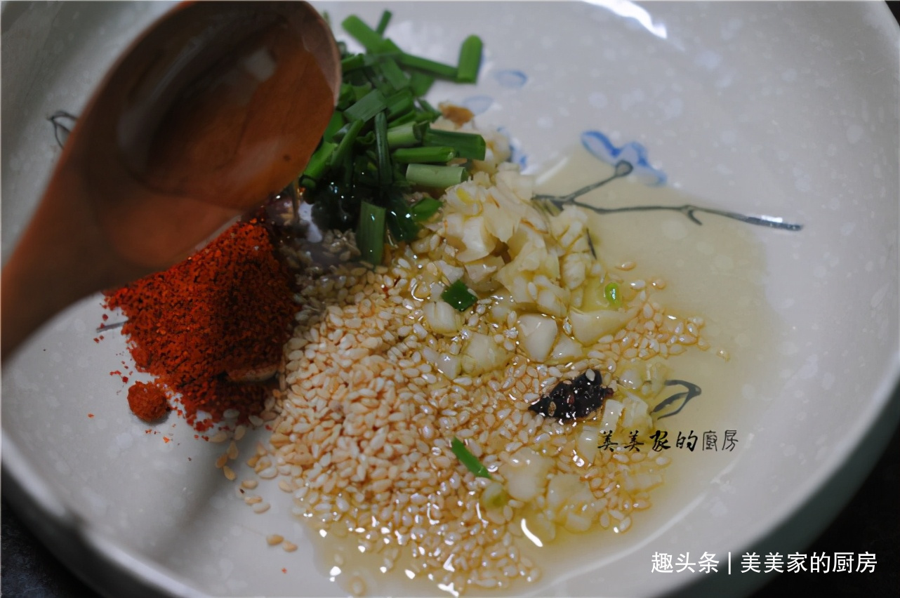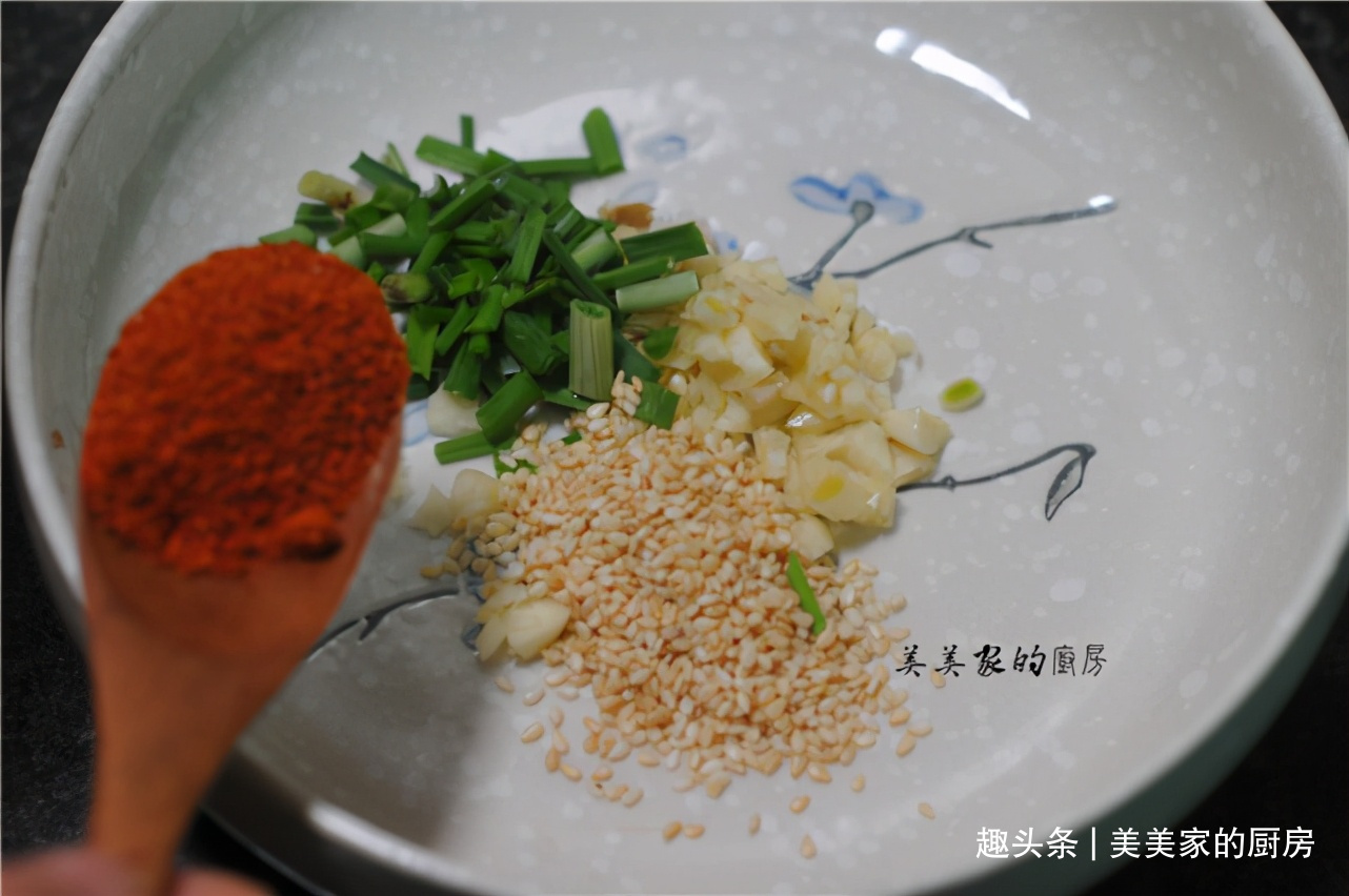 接着咱们来调个料汁,葱花、蒜末、白芝麻放入碗中,加入一勺辣椒粉。