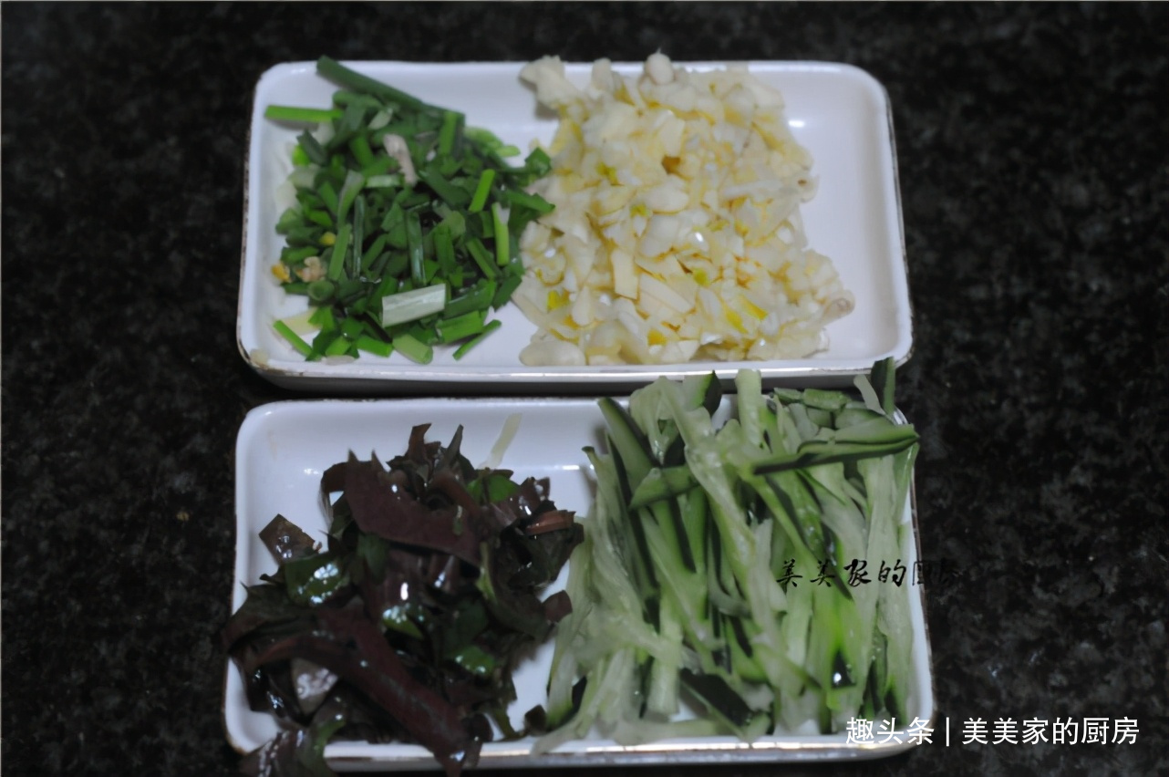 葱切花,蒜切末,鱼腥草稍微切短点,黄瓜切丝备用。如果不吃鱼腥草,也可以换成香菜。