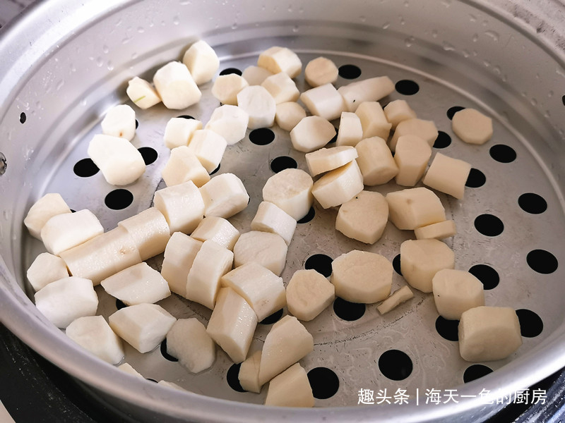 山药洗净去皮,切成小段,倒在蒸屉上,开大火蒸至软烂;