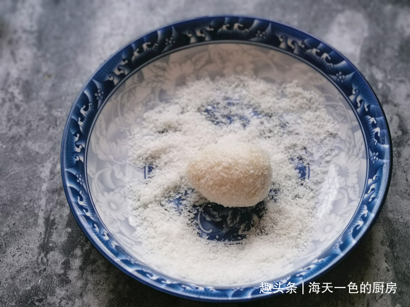 将椰蓉倒在盘子里,把做好了山药草莓大福放在里面,在椰蓉里滚一圈,使表面沾上一层椰蓉,就做好了,其它的也依次做好,直到把山药泥用光。