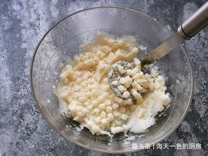 把山药倒在大碗中,趁热加入白糖,用压泥器压成山药泥;