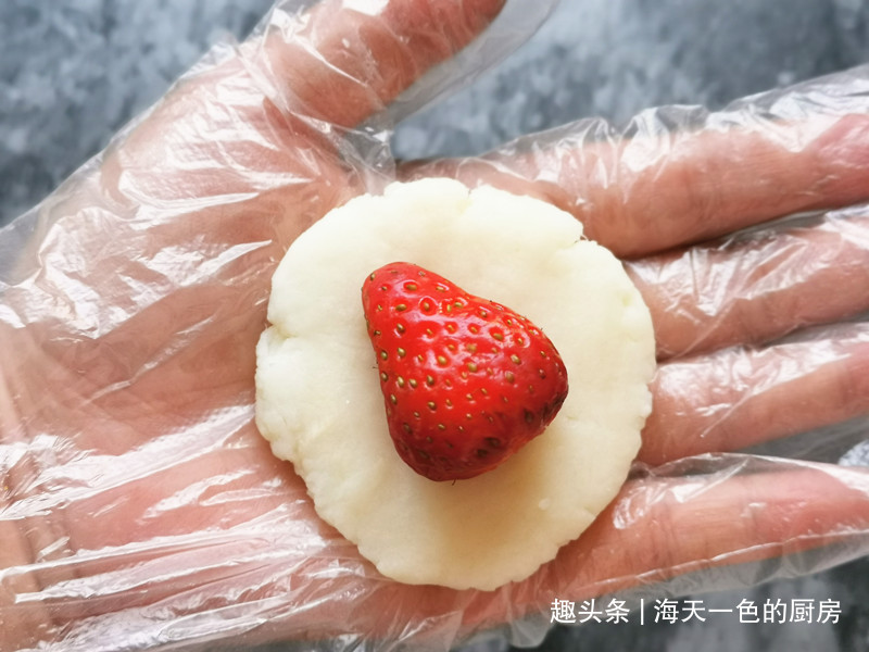 手上戴一次性手套,等山药泥晾凉后,取一块先用掌心搓成球状,再按压成圆饼,取一个草莓包入里面,收口处封好;
