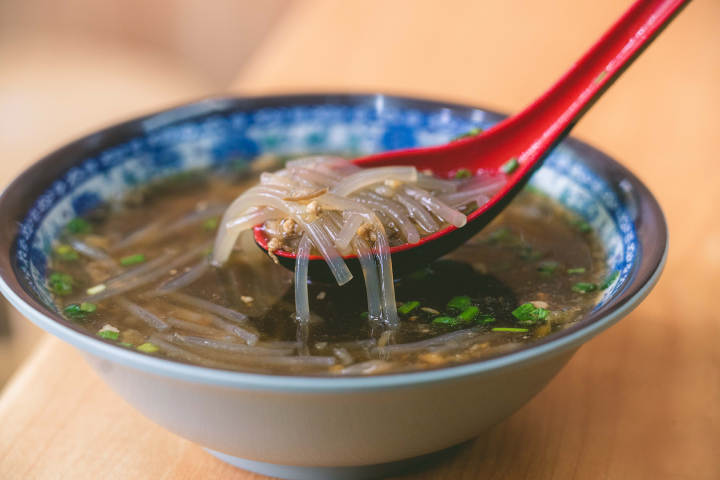 吃生煎包可以配牛肉粉丝,汤看起来很清,却是用牛骨炖的,汤头非常浓郁,还能吃到很多牛肉粒。