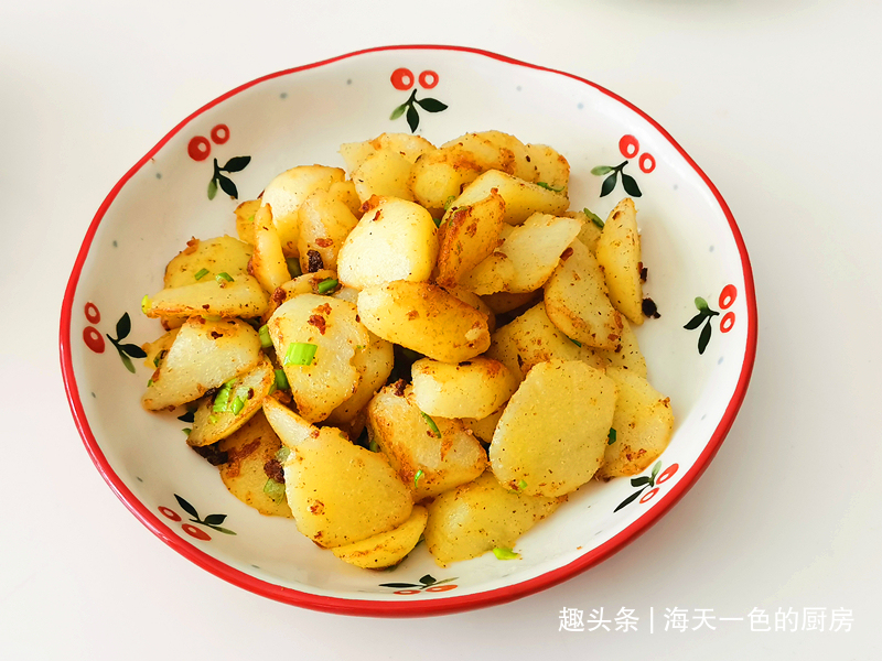 具体做法:把土豆外皮洗干净,用刮刀将皮刮掉,再冲洗干净,切成滚刀块,这里切滚刀块是为了让它也调味料接触多,方便入味;锅中烧开水,放几滴油,撒少许盐,把土豆块放入汆烫2分钟后,用漏勺捞出控干水分;平底锅中倒入花生油,把土豆块倒入小火翻炒至水分收干;继续翻炒至土豆块每一面都变成金黄;撒上盐和孜然粉翻炒入味,再撒上切碎的葱叶就可以出锅了。