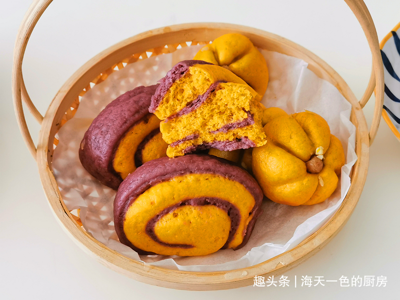 具体做法:先来处理南瓜和紫薯,南瓜选择老点的,甜度高蒸出来也软糯,把南瓜的外皮洗净后刮掉,再用勺子将南瓜瓤去掉,切成小块,紫薯洗净去皮后也切成小块,与南瓜一起放入蒸屉上,注意不要混合放哦,可以一样放一边,这样颜色才不会混合,将蒸屉放在蒸锅上,水开后大火蒸15分钟;时间到了,再焖两三分钟,用筷子夹一下试试,南瓜和紫薯可以轻易夹断就可以了;把南瓜泥和紫薯泥分开倒入大碗中,用勺子底部按压成泥,并晾至温热,再分别倒入一半面粉,加入一半的酵母,分别揉成一个黄色面团和一个紫色面团,分别盖上盖子醒发至两倍大;面团发酵好后,取出分别揉匀,并分别擀成长方形的面皮,厚度在1厘米左右;把黄色的面皮放在下面,上面刷上一层薄薄的水,再把紫色的面片盖在上面,用手按压一下,然后顺长边卷起来,卷成一个圆筒状;