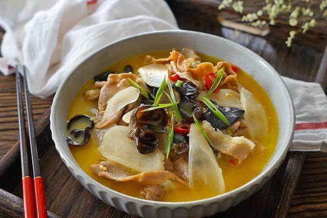 材料:泡菜萝卜100克、牛肉卷150克、黑木耳20克、山药60克、葱1棵、生姜4片、红辣椒4个、蒜头4个、盐适量、鸡精少许