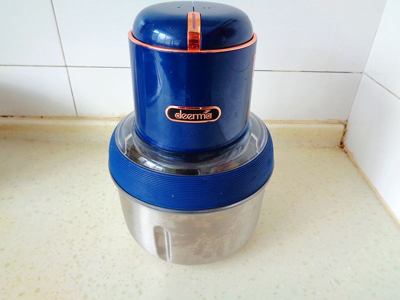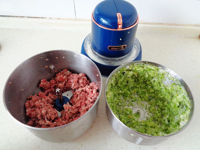 3、把牛肉用菜刀分切块,加绞肉机里,启动打成牛肉末,我家人喜欢吃有口感的饺子馅,不喜欢打成肉泥,这个德尔玛绞肉机可以任意绞成你喜欢的肉泥,看你的口味