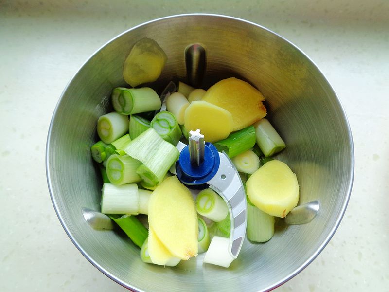 2、把大葱去掉外皮洗净沥干水分,姜去皮,一起加料理机打成末,花椒粒洗洗用凉水泡10分钟