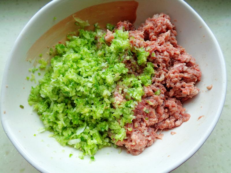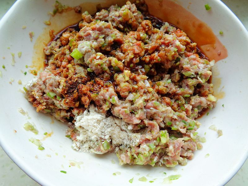 7、加盐、熟菜籽油拌均匀,静置一会入味,这样牛肉馅比较好吃,很入味
