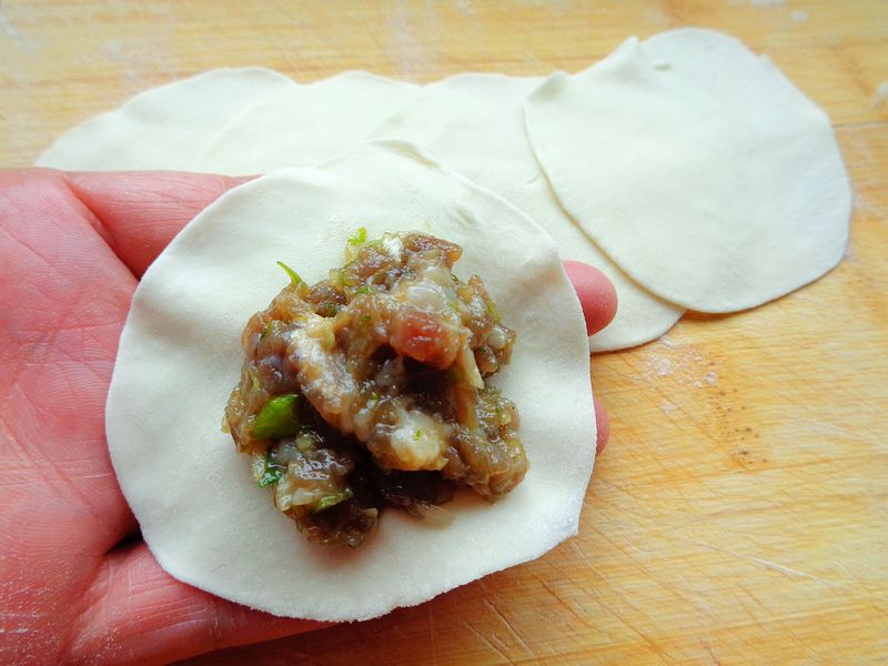 9、擀成中间厚,边边薄的小饺子皮,加上肉馅