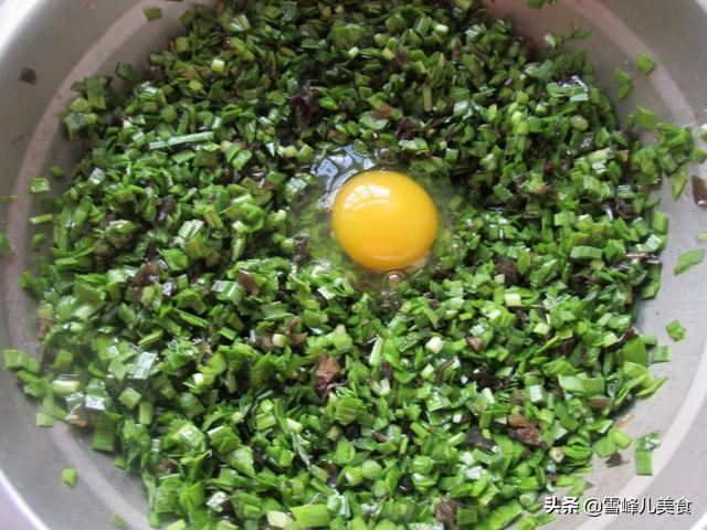 第二步韭菜切碎,鸡毛菜切碎,黑木耳泡发洗净剁碎,一起放入盆里,加入花生油拌匀,再加入盐和鸡精调味,饺子馅就可以了。鸡蛋我们用鲜鸡蛋,擀完皮以后再打入鸡蛋。