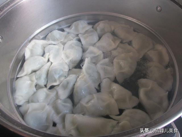 第八步:锅里烧开水,煮上饺子,用勺子轻轻推动,让饺子动起来就不会粘锅了,盖上盖子,开锅以后撒冷水激一下继续盖上盖子煮,大约重复3次,饺子就熟透了。